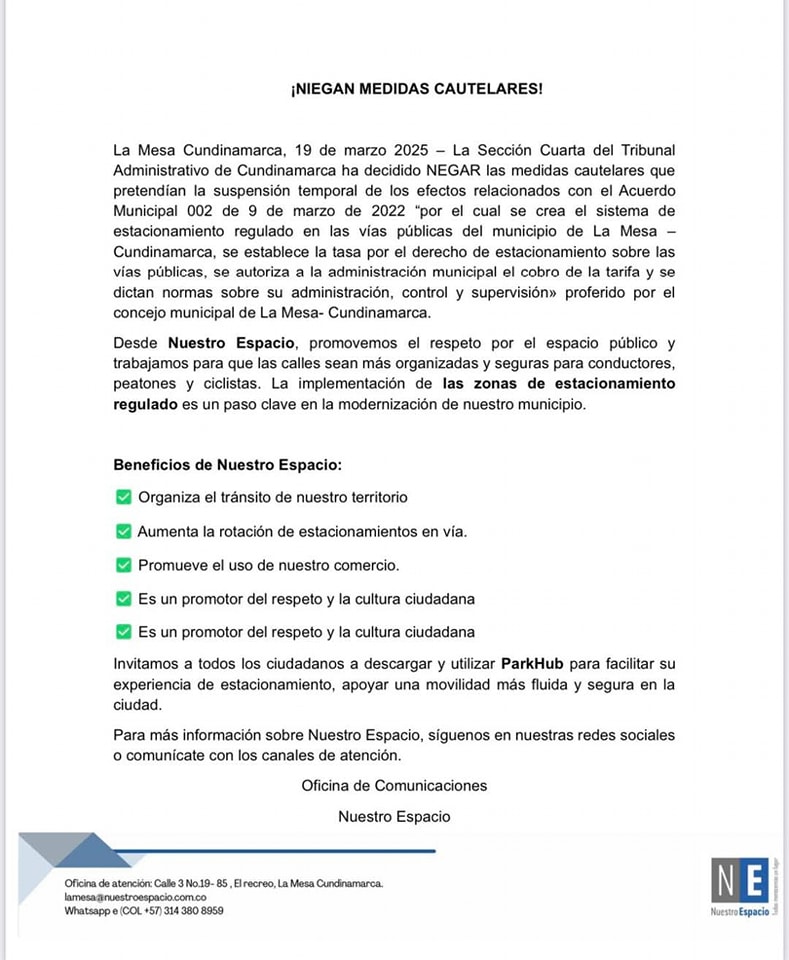 La Mesa Cundinamarca, 19 de marzo 2025 – La Sección Cuarta del Tribunal Administrativo de Cundinamarca ha decidido NEGAR las medidas cautelares que pretendían la suspensión temporal de los efectos relacionados con el Acuerdo Municipal 002 de 9 de marzo de 2022 “por el cual se crea el sistema de estacionamiento regulado en las vías públicas del municipio de La Mesa – Cundinamarca, se establece la tasa por el derecho de estacionamiento sobre las vías públicas, se autoriza a la administración municipal el cobro de la tarifa y se dictan normas sobre su administración, control y supervisión» proferido por el concejo municipal de La Mesa- Cundinamarca.